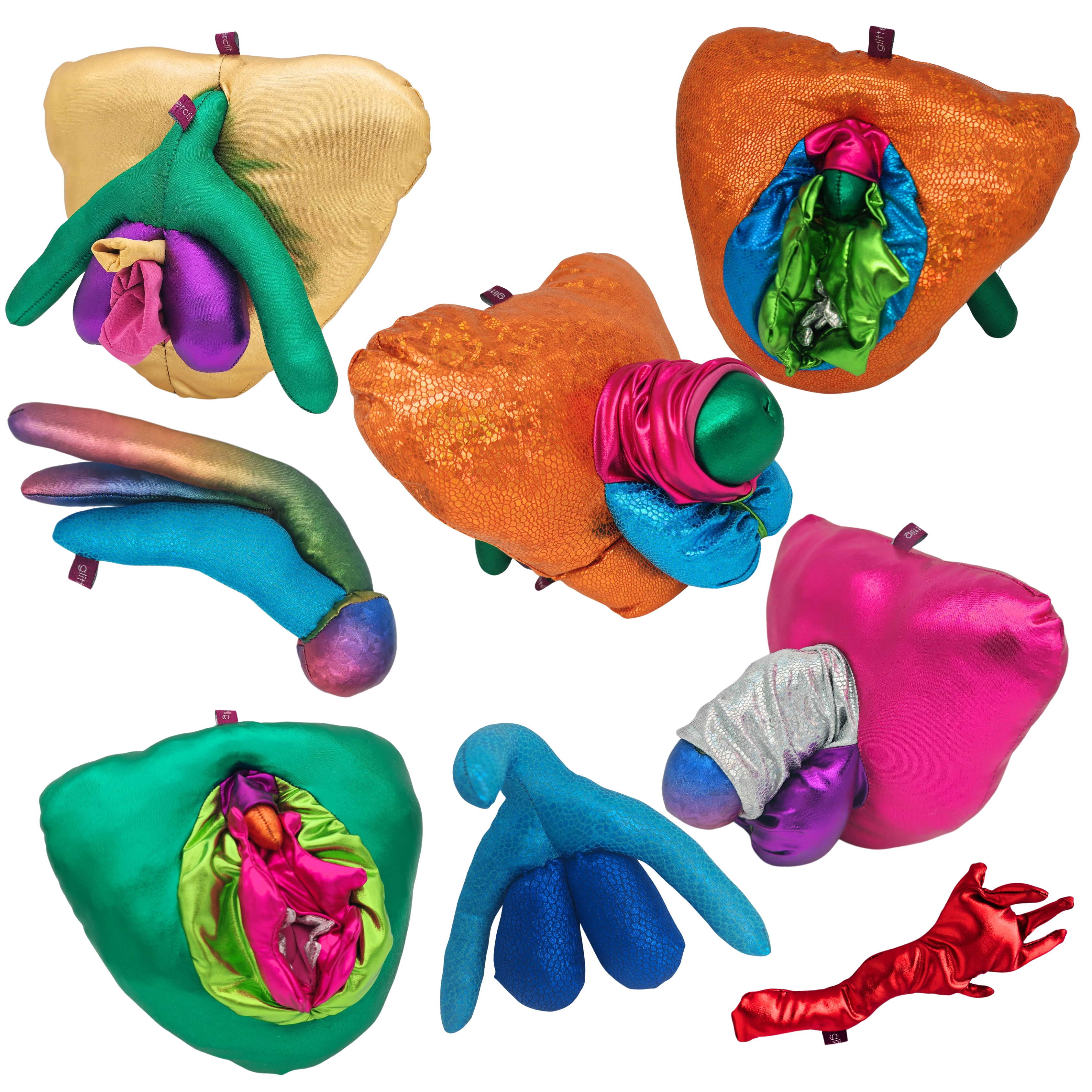 - glitzernde Genitalmodelle: Vulva und Penis mit jeweils herausnehmbaren Schwellkörpern, geliefert mit zugehörigem Vermittlungsmaterial
